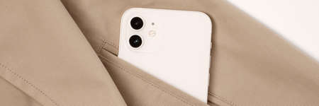 Modern smart phone in cream colour in the pocket of beige trench coat