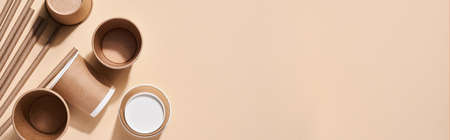 Brown paper drinking straws and eco paper glasses cornstarch, biodegradable material on beige with shade from the leaves on the beach. Zero waste and plastic free concept. Top view. Banner.