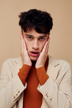 a handsome, attractive man stands on a beige background in stylish clothes and holds on with one hand to the other