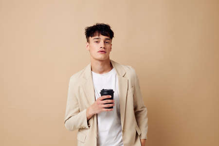 Photo young boyfriend a man in a light jacket a glass with a drink light background unaltered