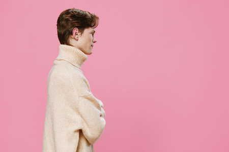 the guy is standing sideways to the camera with his face turned away in a beige turtleneck sweater on a pink background with an empty space for inserting text