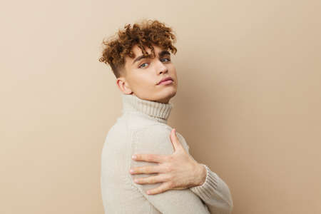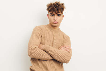 a cute, stylish, curly-haired man stands on a light background, looking pleasantly at the camera, in a beige sweater, with his arms crossed on his chest