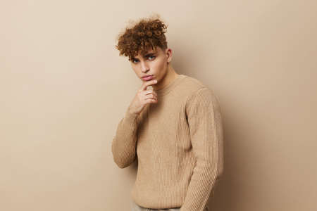a close horizontal portrait of a handsome, charming man with curly hair standing in a beige sweater on a beige background, thoughtfully holding his hand on his chin