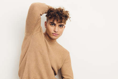 a cute, stylish, curly-haired man stands on a light background looking pleasantly at the camera, in a beige sweater, holding his hands behind his head