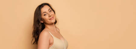 panoramic shot of young brunette woman in bra looking at camera on beige