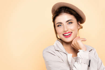 joyful, fashionable woman in beret holding hand near chin while looking at camera isolated on peach