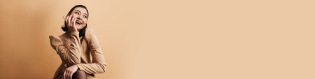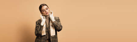 young woman in stylish blazer and white gloves posing with hands near face on beige, banner