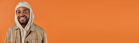 A stylish African American man in a hoodie posing confidently against a vibrant orange backdrop.