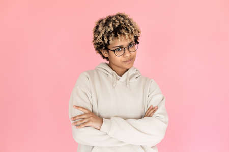 African American woman showing dislike. Female model in glasses with curly hair with crossed arms, looking at camera. Portrait, emotion, studio shot concept