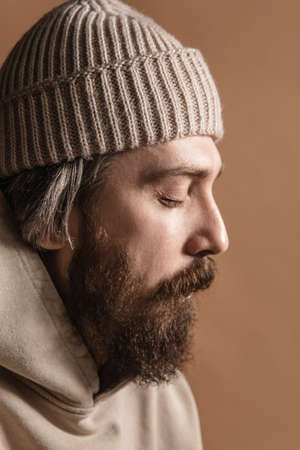 Close-up Caucasian mustached and bearded man in hat isolated on light background