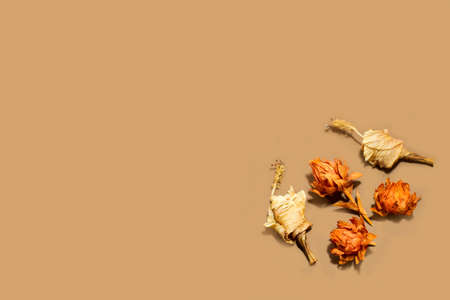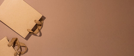 Packaging gift kraft brown packages on a brown cardboard background. Top view, flat lay. Banner.