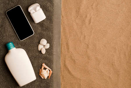 summer concept on the beach, cris towel on the beach sand, black screen smartphone, bottle of cream and shells, white stones. Sandy beach. Top view. space for text