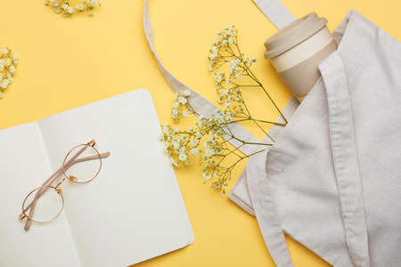 Eco bag with thermo cup, notebook and eyeglasses on color background