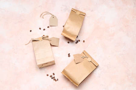 hand holding a full paper bag of brown kraft paper on brown background, close up