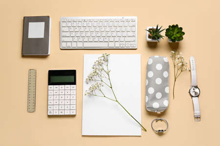 Stylish pencil case, female accessories, keyboard and stationery on color background