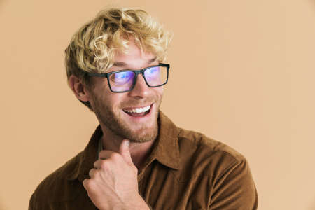 White blonde man in eyeglasses smiling and looking aside isolated over beige background