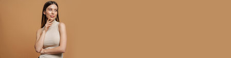 brunette woman adjusting turtleneck and looking away isolated on beige, banner