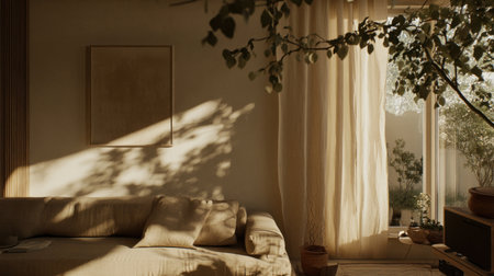 A bright, minimalist living room with natural lighting and shadows. The space features a sofa, plants, and simple decor, showcasing a clean, interior design style. The high-resolution, professional photograph captures the room's sharp focus and high level of detail, creating a serene, natural environment. --chaos 30 --ar 16:9 --v 6.1 Job ID: 273ad9ff-18e5-434e-9dc2-042d4acc1e48