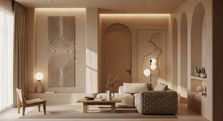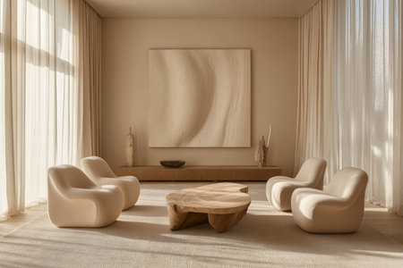 This interior design showcases a modern living room with a neutral color palette. The scene features a sofa, chairs, and decorative elements. Soft lighting highlights the textures and shapes of the room. The composition is suitable for various commercial applications, emphasizing design and aesthetics.