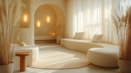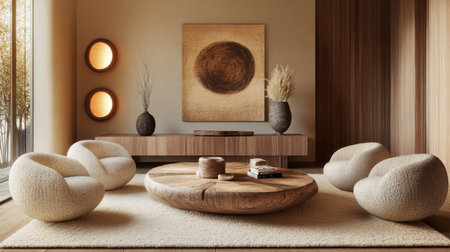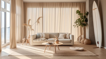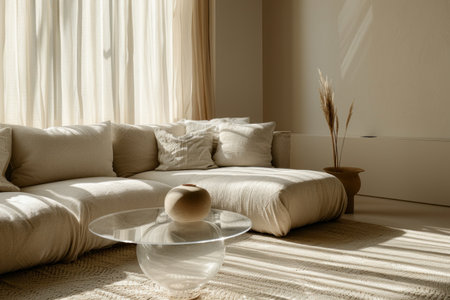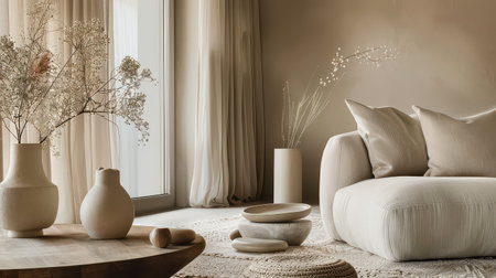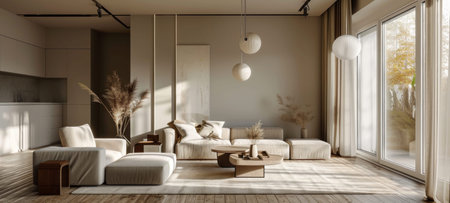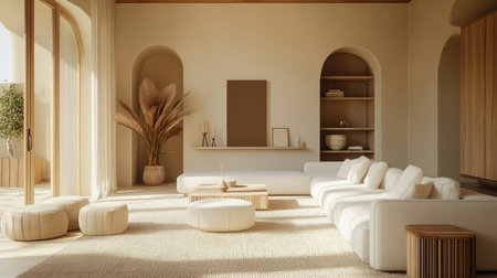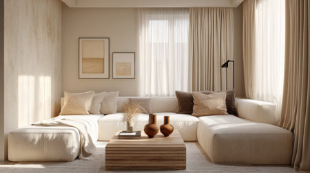 A beautifully designed minimalist living room featuring soft textures and warm tones. Natural light pours through large windows, creating a serene atmosphere ideal for relaxation and stylish living.
