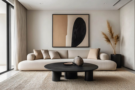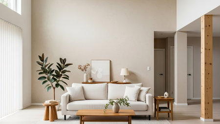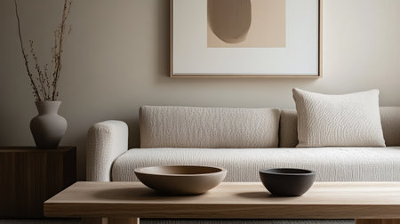 showing minimalist scandinavian living room with neutral tones and natural featuring a white sofa and abstract. resolution use.
