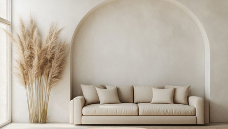 Minimalist interior design of a modern living room with a beige sofa, arched wall, and pampas grass in the front view. --ar 53:30 --v 6.1 Job ID: 287b9cf2-032c-47e4-9463-ecafbf0db512