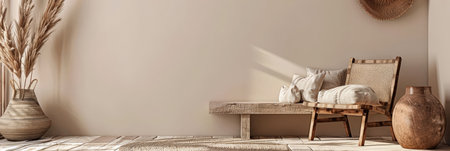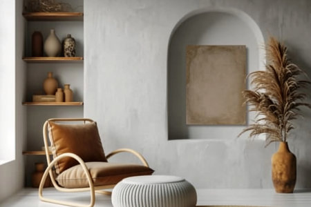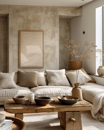 A tranquil living space highlights minimalist design with a rattan pouf, wooden decor, and a neutral color palette, emphasizing natural textures and soft lighting.
