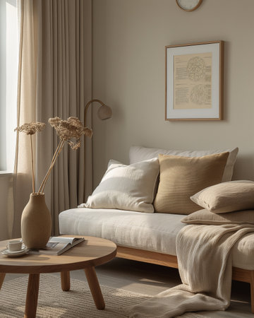 A cozy and inviting living room scene bathed in soft, natural light. A comfortable beige sofa is adorned with plush pillows and a soft, textured blanket. A steaming cup of coffee sits on a small wooden table, adding to the warm and relaxing atmosphere. A potted green plant near the window brings a touch of nature indoors.