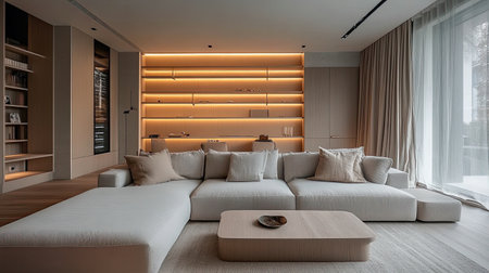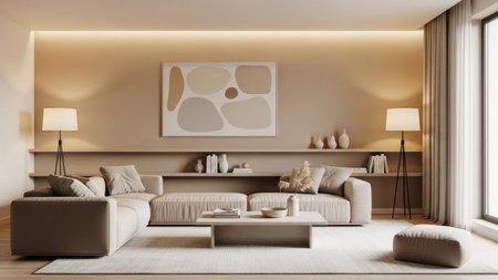 This interior depicts a contemporary living room arrangement. It features a sectional sofa, coffee table, and lamps, all in a soft, neutral color palette. The composition includes a painting and decorative items on a shelf, with window and curtains. This image can be used for various commercial or editorial purposes.