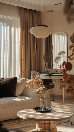This image showcases a modern living room featuring a sofa, armchair, and coffee table. The neutral color palette includes beige, white, and brown tones, with natural lighting enhancing the space. The composition suggests a comfortable and inviting atmosphere, potentially suitable for interior design, home decor, or lifestyle related content.