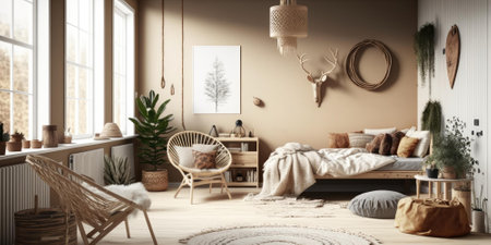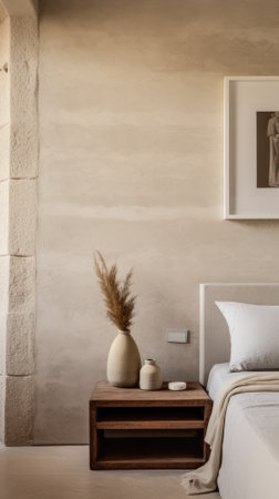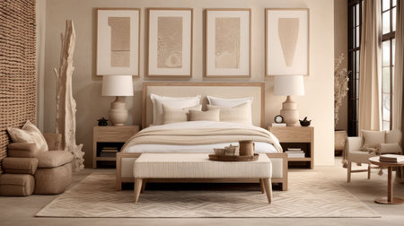 a bedroom featuring beige walls and wooden furniture, showcasing a monochromatic symmetry style. the room is adorned with textured canvas artwork, delicately rendered landscapes, and minimalist sets. the furniture is made of restored and repurposed wood, adding a layered and textured aesthetic to the overall design. ai generated
