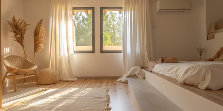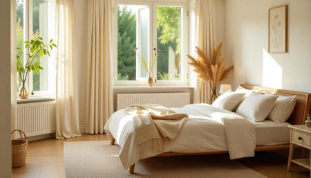 Sunlit bedroom interior design with calming and neutral palette