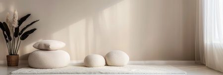Serene minimalist room interiors in soft colors with minimal zen decor and copy space. Relaxing Real Estate interiors.