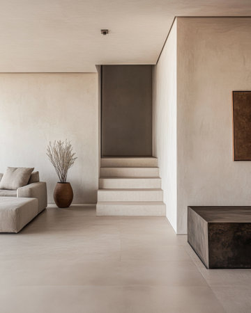 Interiors designer composition in a luxury minimalist property with minimal furniture, copy space and neutral colors.