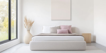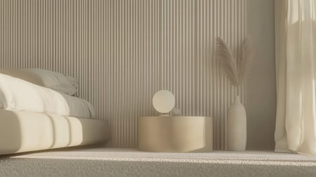 A serene minimalist bedroom featuring soft natural light and calming decor elements, creating a peaceful and relaxing atmosphere ideal for comfort.