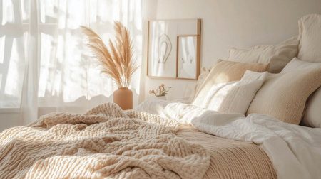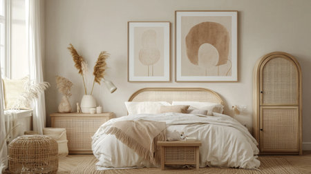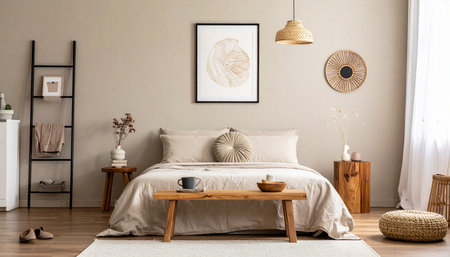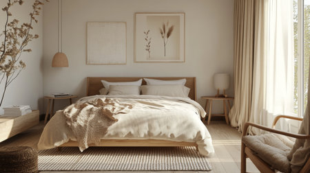 A cozy and stylish bedroom featuring neutral color palette, natural materials, and minimalist decor. room includes large bed with soft linens, decorative wall art, and elegant furnishings that
