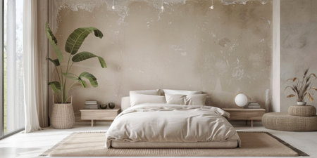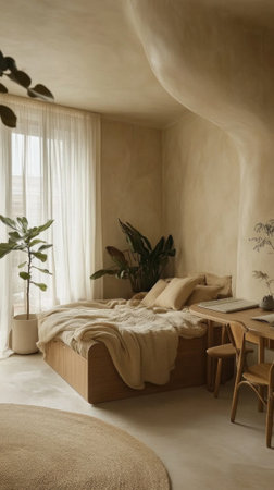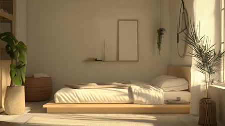 Minimalist earth-toned bedroom with plants and natural lighting.