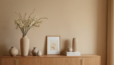Interior of modern living room with wooden commode, vase and mock up poster frame