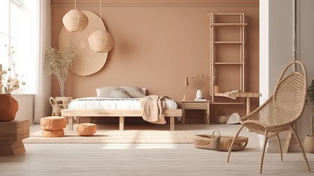 Serene minimalist bedroom in peach tone. Interiors composition in a luxury home