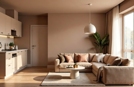 A stylish living room combined with a kitchen with a sofa, a coffee table, and a painting on the wall, in the trendy mocho mousse color and minimalistic design create the perfect space for relaxation.