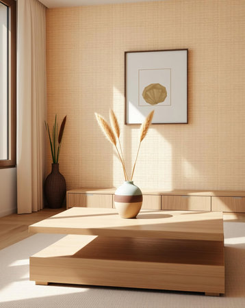 Close-up of minimalist decor elements in a living room, including a low coffee table, simple artwork, and subtle color accents