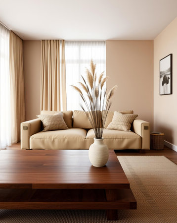 A warm and inviting living room with a beige sofa, textured pillows, and a large wooden coffee table. The room is filled with natural light and complemented by curtains and minimalist art.