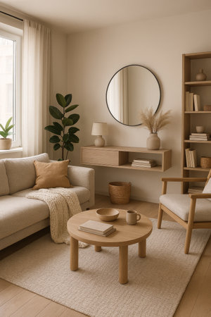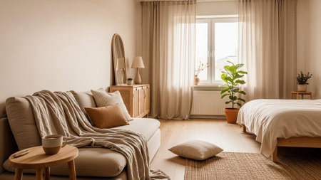 A bright and airy Scandinavian-style living room bathed in natural light streaming through sheer curtains. The space a comfortable beige sofa adorned with soft throw blankets and accent pillows. A minimalist wooden coffee table and side table complement the light wooden floor. A tall potted plant adds a touch of green, and a round mirror reflects the soft light. The overall aesthetic is serene, uncluttered, and inviting, embodying a sense of cozy minimalism.