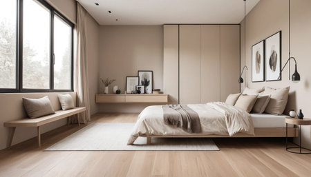 Modern minimalist bedroom interior in neutral colors with a bed next to a window and elegant decor.