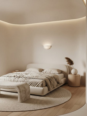 A minimalist bedroom features a low bed with neutral bedding, a textured bench, and a round rug on a wooden floor under a curved ceiling with soft lighting.