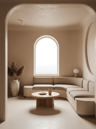 A minimalist living room features a curved beige sofa, a round wooden coffee table, and a large arched window allowing natural light into the serene, neutral-toned space.