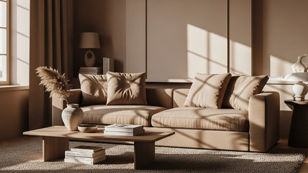 Minimalistic living room composition with a sofa and a vase in clear colors