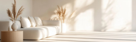 A cozy living space features a white sofa adorned with soft cushions, accompanied by a decorative vase of pampas grass. Gentle shadows create a serene atmosphere.