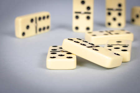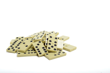 Dominoes game pieces stacked on a white background.