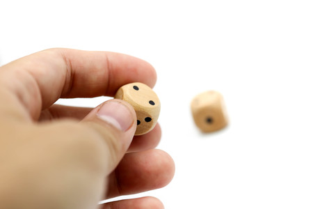 A hand rolls a wooden dices on white isolated background.